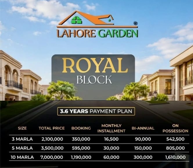 Lahore Garden Royal Block offers an affordable residential opportunity with a flexible 3.6-year installment plan, making it ideal for both investors and end users. With easy booking, monthly installments, and a well-planned location, it provides a convenient way to own a plot in a developing housing scheme near Lahore.